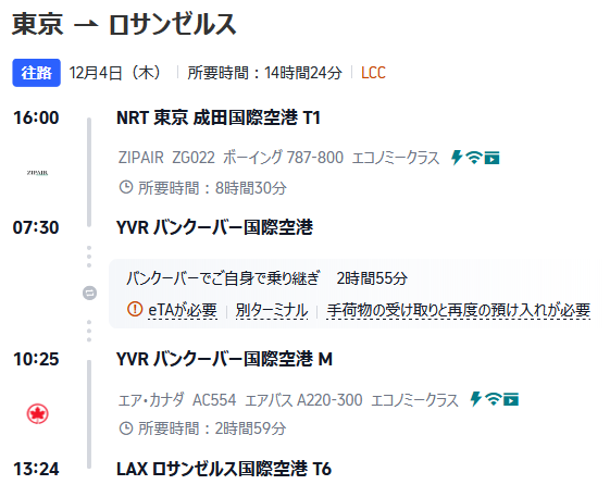 この方法は、ジップエアの成田⇒ロサンゼルス便の予約が取れなかった場合に有効です。ただし、バンクーバーでの乗り継ぎは別ターミナルになる他、カナダのeTA(電子渡航認証)が必要です。