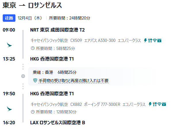 検索当時の価格は77,090円で、他の選択肢よりは少し高めです。利用する航空会社はキャセイパシフィック航空で、香港国際空港でのトランジットは非常にスムーズです。