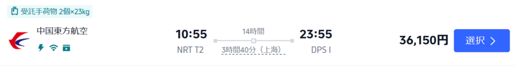2つ目は中国東方航空を利用する方法です。この例では成田~上海~デンパサールとなっていますが、ルートはいくつかあります。価格帯や所要時間は1つ目の例とほぼ同じです。中国東方航空もフルサービスキャリアですが、格安で利用できると分かりますね。